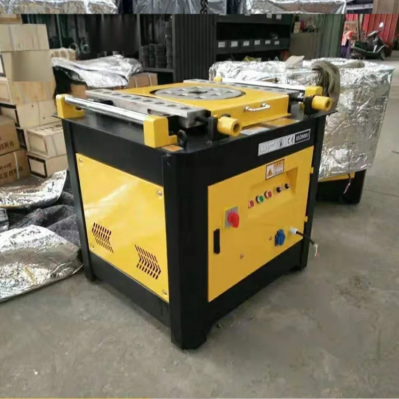 Steel bending machine, one of the rebar processing machinery. The working mechanism is a horizontal working disc that rotates on a vertical axis. The steel bars are placed at the dotted line in the figure, the supporting pin is fixed on the machine tool, the center pin and the bending pin are installed on the working disc, and the disc rotates When the steel bar is bent. In order to bend steel bars of various diameters, there are several holes on the working plate for inserting and pressing the bending pins, and the center pins of different diameters can be replaced accordingly